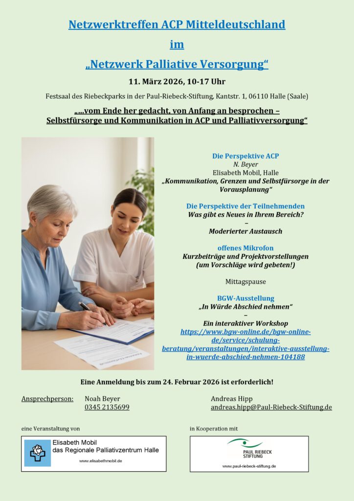 wir laden Sie herzlich zum Netzwerktreffen ACP Mitteldeutschland im „Netzwerk Palliative Versorgung“ am 11. März 2026 von 10–17 Uhr ein. Die Veranstaltung findet im Festsaal des Riebeckparks in der Paul-Riebeck-Stiftung, Kantstraße 1, 06110 Halle (Saale) statt.